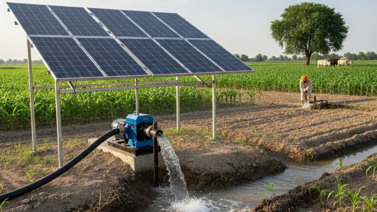 A happy farmer standing beside a solar-powered irrigation pump in a lush green field under a bright sky.
