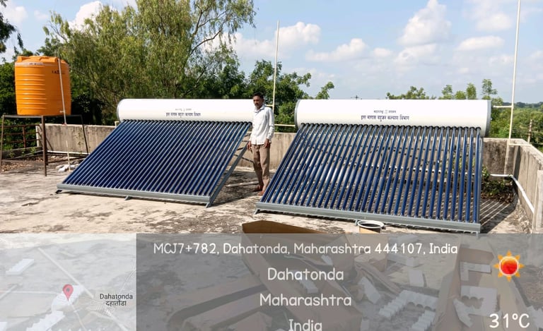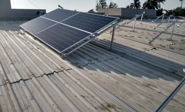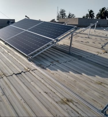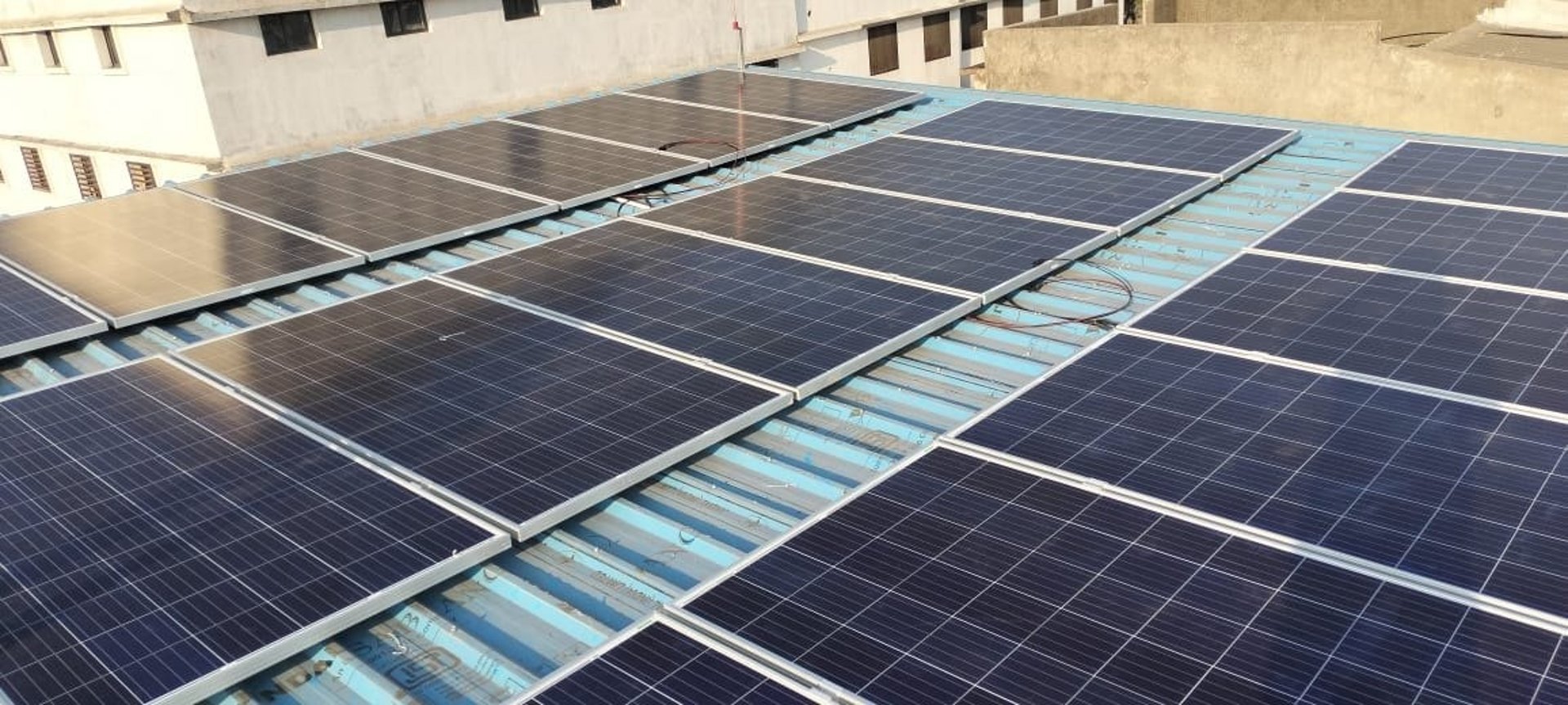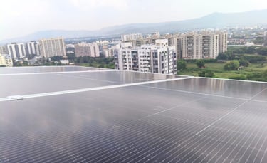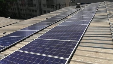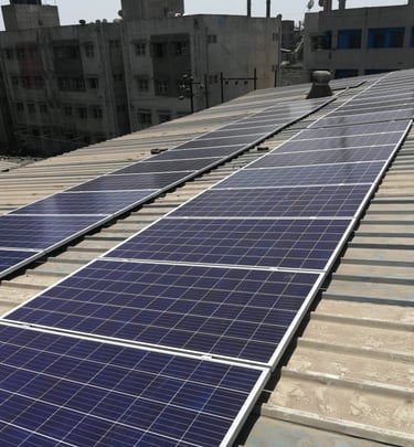 A vibrant solar panel installation on a sunny commercial rooftop.